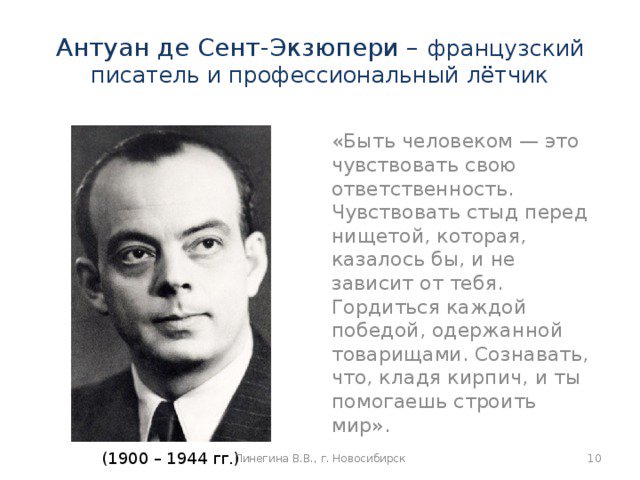 Антуан Мари Жан-Батист Роже де Сент-Экзюпери — французский писатель, поэт и профессиональный лётчик. Антуан де Сент-Экзюпери родился 29 июня 1900 г. во французском городе Лионе, в семье провинциального дворянина. В возрасте четырёх лет потерял отца. Воспитанием маленького Антуана занималась мать. Экзюпери окончил школу иезуитов в Ле-Мане, учился в католическом пансионе в Швейцарии, а в 1917 году поступил в парижскую Школу изящных искусств на факультет архитектуры.
