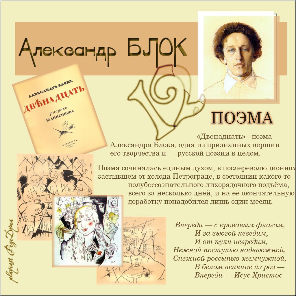 Поэма А. А. Блока «Двенадцать» посвящена теме революции. Сюжет описывает, как двенадцать красноармейцев патрулируют город, и из этих фрагментов складывается общая картина жизни после революции. Анализ поэмы «12» Блока позволяет найти истоки написания произведения, определить основную мысль поэмы, принадлежность к определённому литературному направлению, её жанровые и композиционные особенности.