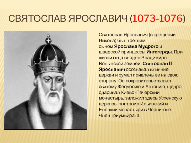 Личность Ярослава. Ярослав Мудрый вошел в русскую историю не только как крупный государственный деятель, при котором Русь вышла прочной поступью на международную арену, одержала ряд побед над своими соперниками, отличалась в течение долгих лет внутренним единством. Он показал себя и как человек, сумевший преодолеть самого себя.